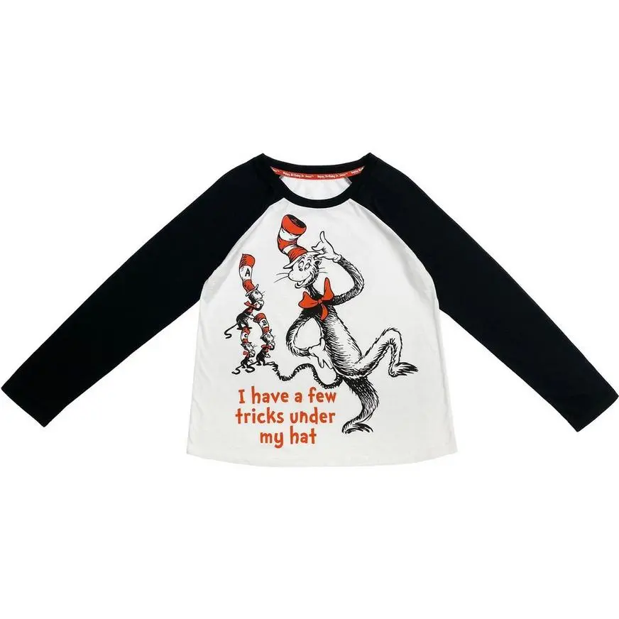 Dress up for Dr. Seuss Day in style with this Dr. Seuss Raglan Tee. This long sleeve polyester jersey features the headline “I Have A Few Tricks Under My Hat” alongside The Cat and his little cats.