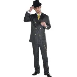Make sure no one steps out of line as the Head Honcho! This 20s-style gangster costume includes a double-breasted pinstripe jacket, matching pants with a wallet chain, and a dickie with a faux shirt and tie.