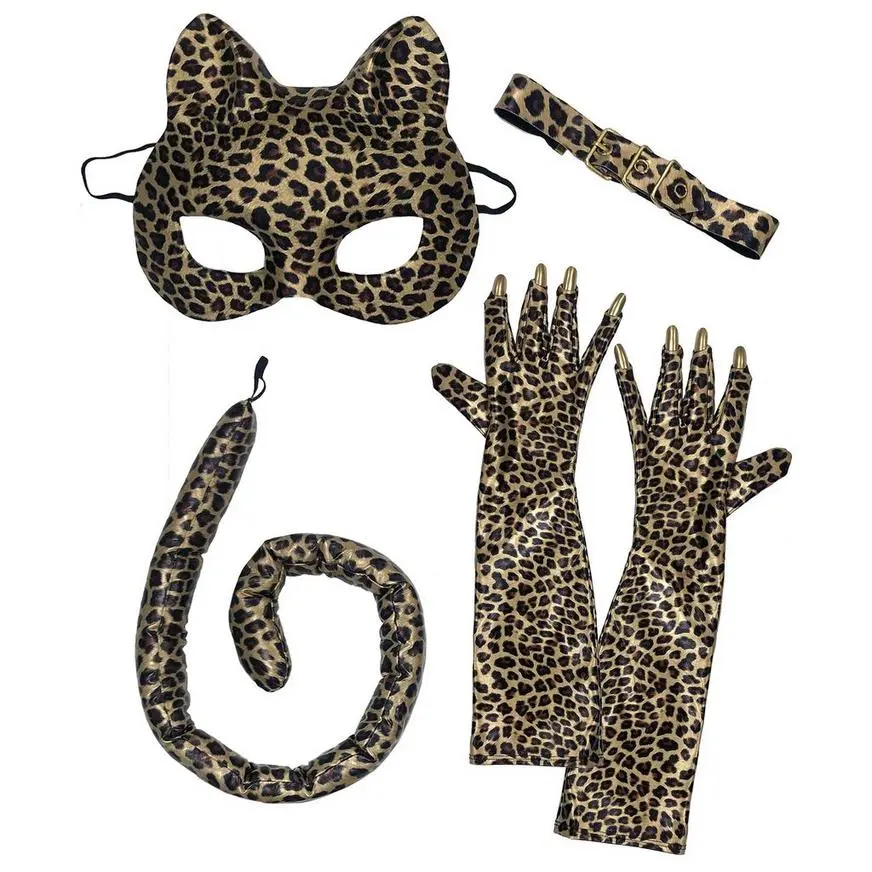 Meee-ow! Create your own feline fatale look with a leopard accessory kit for adults. The set includes a cat mask with attached ears, a matching cat collar choker, and an attachable tail. Slip on the elbow-length gloves with killer gold claws to complete your look.