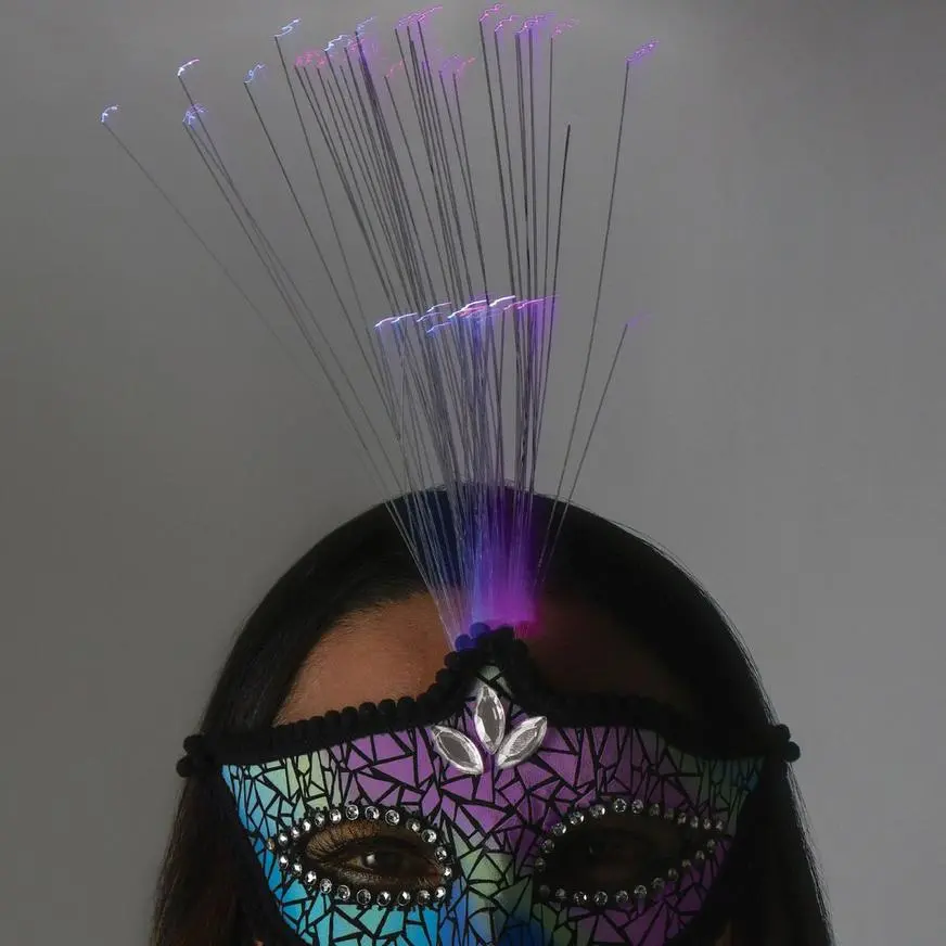 Fiber optic light up mask that has an illuminating rainbow color effect when you take a photo of it with the flash on. The fiber optics on top of center of the mask light up. Velcro closure on elastic band that goes around the head.