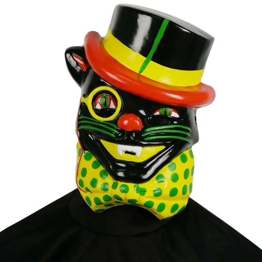 This Vintage Dapper Cat Mask depicts an early 1900s Halloween icon. The black cat dons a black, yellow, and red top hat with a monocle and a giant polka dot bow tie to accessorize.