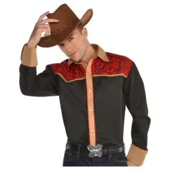 Turn the Halloween party into a rodeo in a Cowboy Shirt for adults! The black shirt features black and red designs, rope trim, and printed embroidery. Pair this shirt with a cowboy hat, jeans, and boots (sold separately) to create your own DIY cowboy costume. Round up all your friends for a good time in this Cowboy Shirt! Review the size chart for additional sizing information. Shoes, hat, belt, and pants not included.