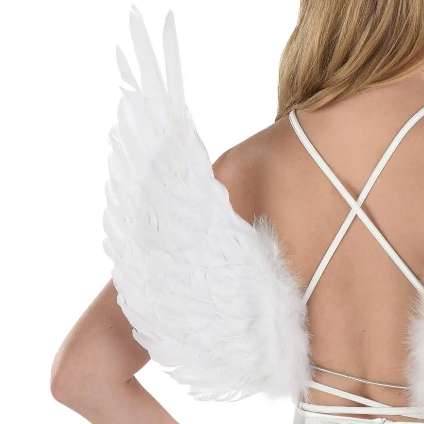 These white angel wings feature an elastic that goes around the waist and plastic wire that attaches to clothing to create a floating illusion.