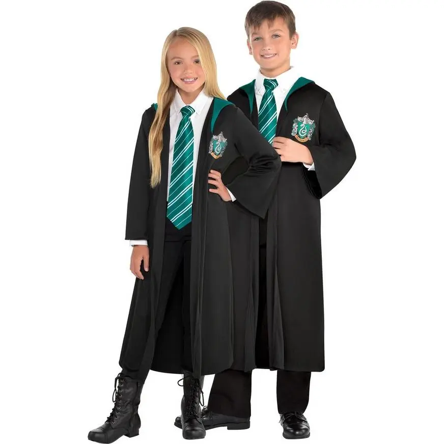 Your child can carry on Salazar Slytherin’s legacy in a Harry Potter Slytherin Robe for kids! The long black polyester robe features the Slytherin logo on the chest and green lining in the hood. Pair this robe with a white value-up shirt, a green tie, and black pants (sold separately) to complete the look. Dress up your little one as a Slytherin in this Slytherin Robe and they’re ready to join the rest of the pure-blood wizards! Review the size chart for additional sizing information. Shoes, tie, shirt, and pants not included.