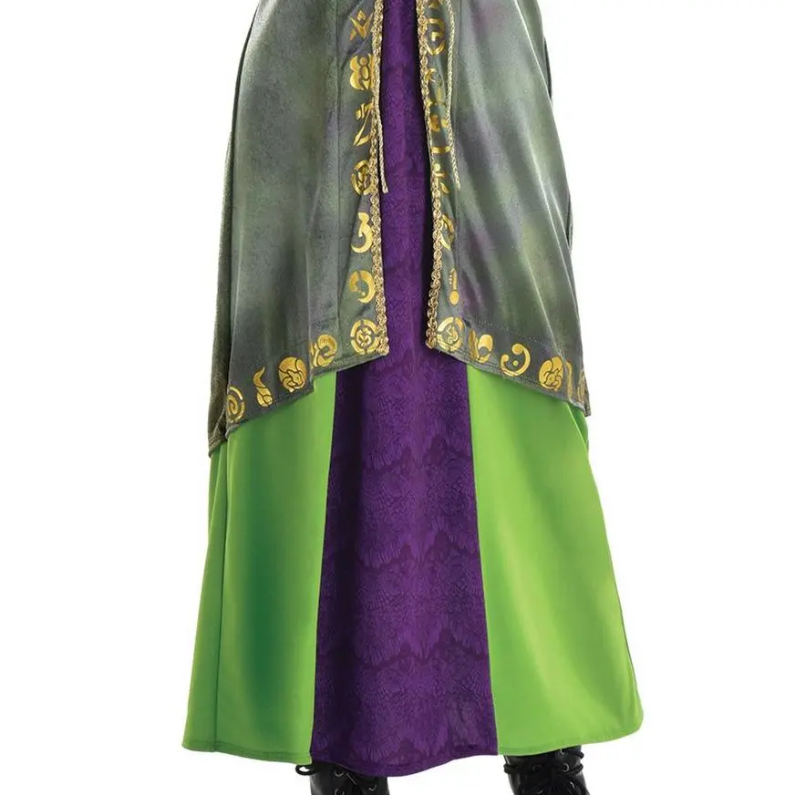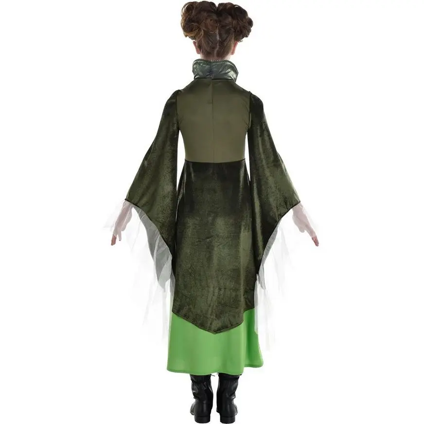 They can cast Halloween spells as the most cunning of the Sanderson sisters in this Winifred costume for kids. It includes an ankle-length green and purple dress with an attached topcoat that features a stand up collar and bell sleeves.