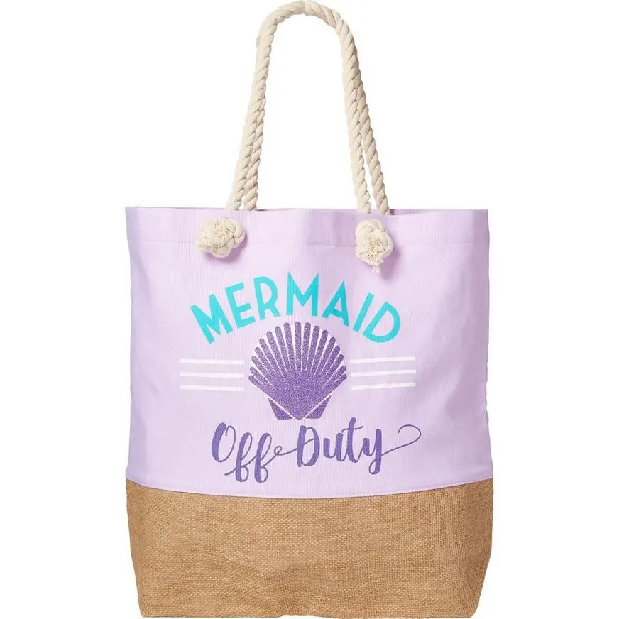Prepare for a beach day by packing all your beach essentials in a Mermaid Tote Bag! The pink canvas tote bag features a purple glitter seashell with a “Mermaid Off Duty” headline. The bag also has attached rope handles. Use this bag to pack towels, sunscreen, and anything else you need for fun in the sun!