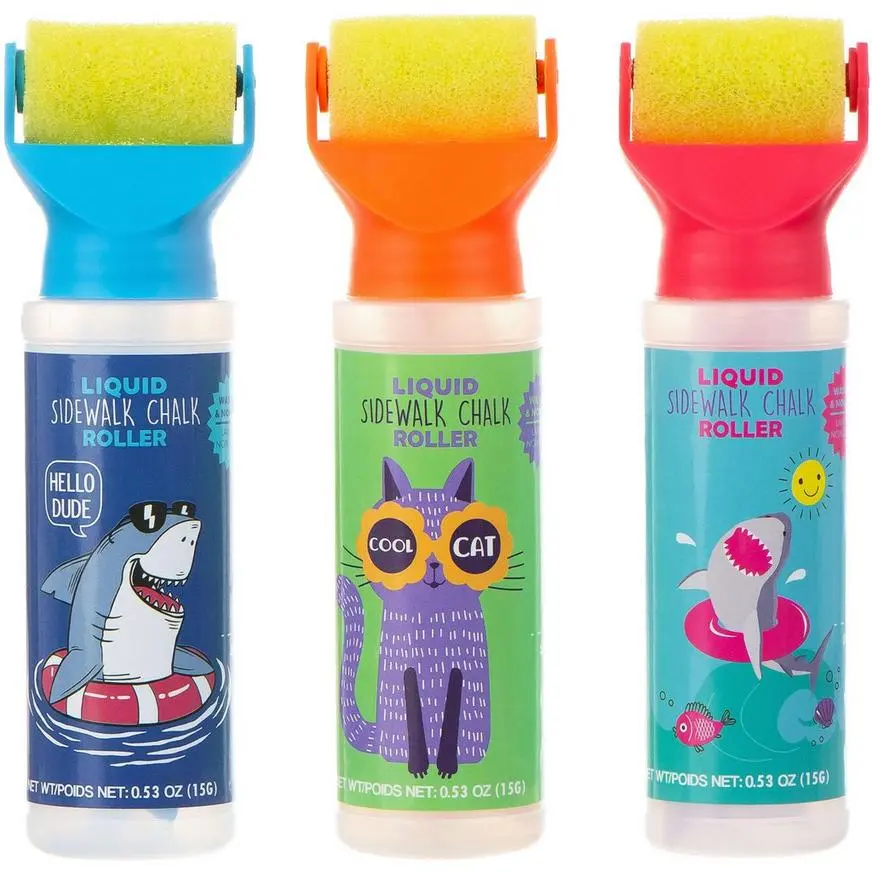 Kids can create sidewalk masterpieces with Liquid Sidewalk Chalk Rollers. The set includes blue, red, and orange roller bottles that have fun shark and cat designs.