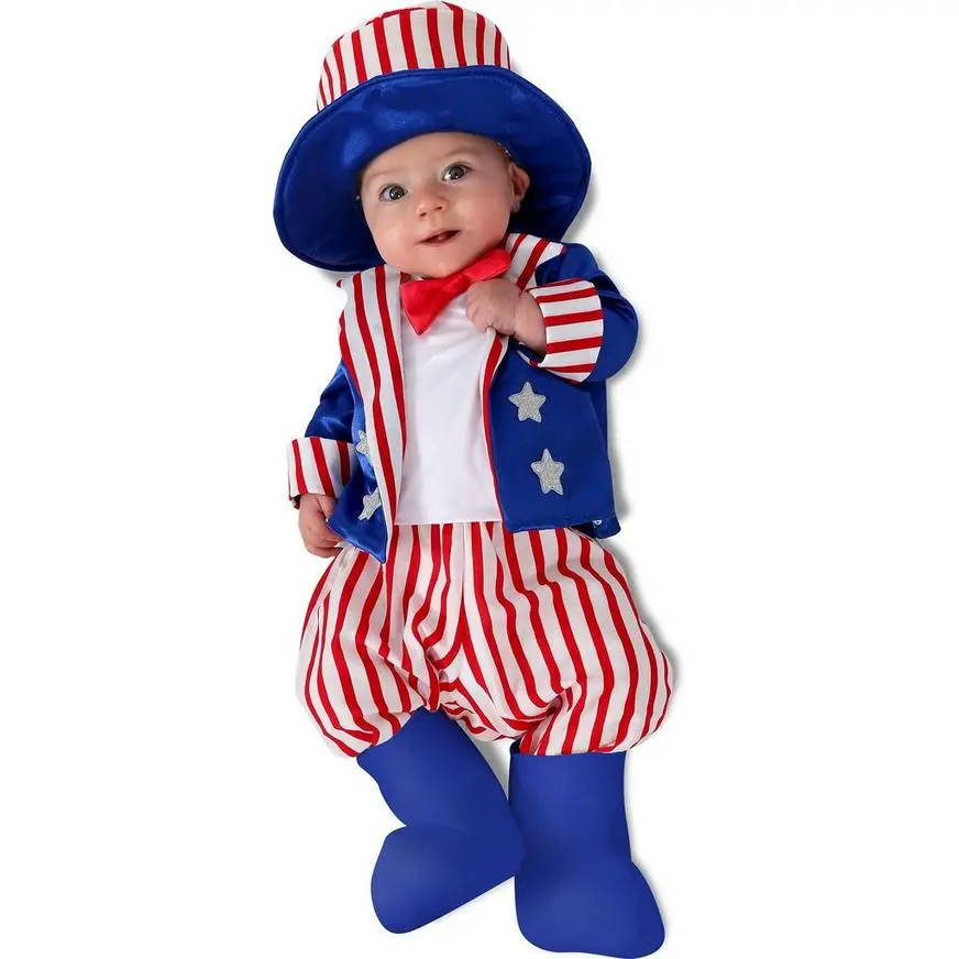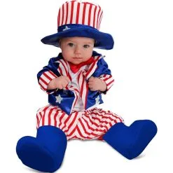 Recruits won’t be able to say no to this face! This Uncle Sam costume for babies features a blue, star-studded jacket with red and white lining, an attached red bow tie, and a pair of red and white striped pants. Top it off with the matching top hat and bright blue booties to finsh the look.