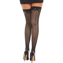 Spice up your look with black fishnet stockings! These thigh-high stockings feature diamond fishnets with a solid black top and a vinyl bow backseam.