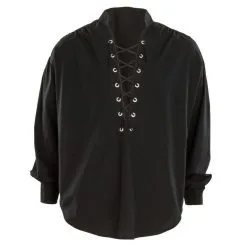 Win booty and lasses in this Black Lace-Up Pirate Shirt! This black collared pirate shirt features a mock collar, relaxed fit, and center lace-up for baring your chest. A relaxed fit and metallic grommets lend an authentic look, and it’s an excellent foundation for your pirate costume!