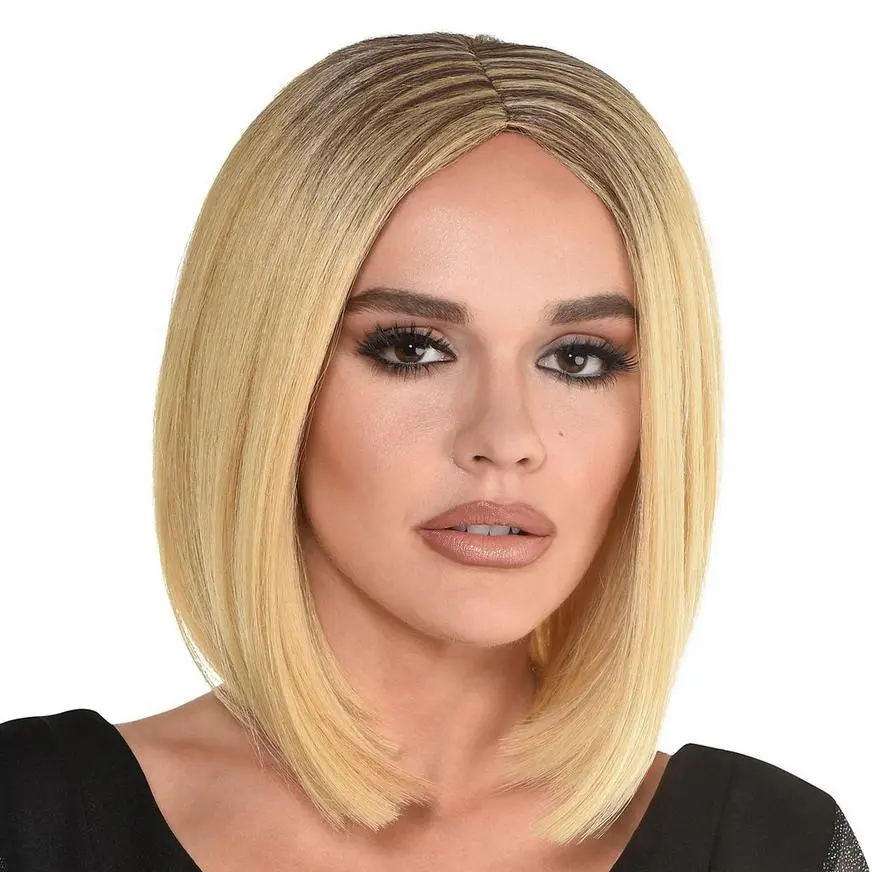 Revenge is a dish best served blond! This fatally attractive wig is strawberry blond with dark roots and features a bob cut.
