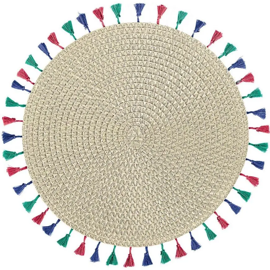 Stay cool this summer with a hip placemat at your dinner party. This straw placemat is the color of unbleached wool and features softly colorful tassels. With its rustic style, this placemat will add bohemian panache to your table settings.