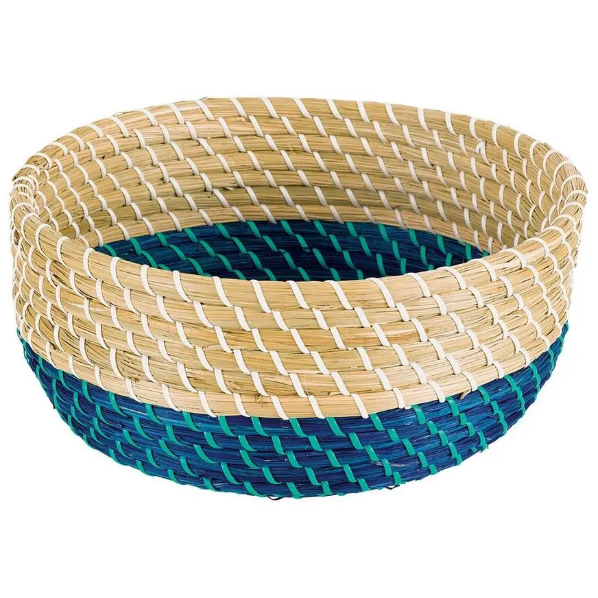 This wicker bowl is a stylish bohemian addition to your summer tableware, especially for outdoor dining. Dyed a deep marine blue on bottom with natural wicker on top, this basket is an understated yet refined way to display fruit, serve bread, or hold silverware at your next summer soiree.