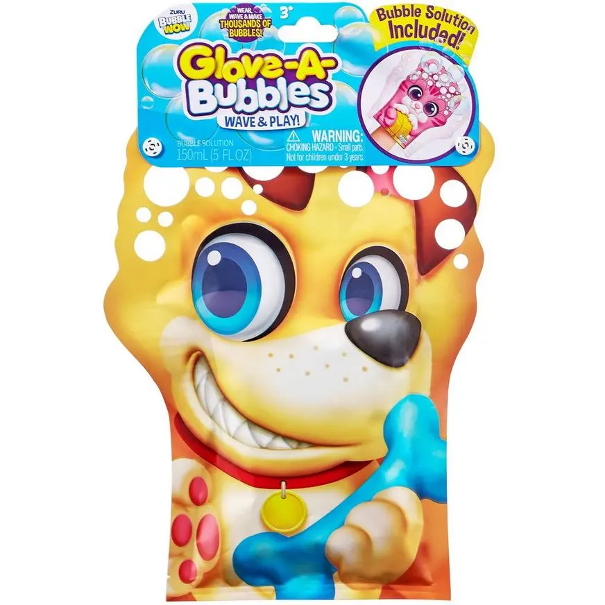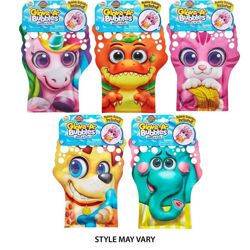 Creating thousands of bubbles has never been easier! Glove-A-Bubbles comes with bubble solution and a cute, on-trend character in an easy-to-use gloved design. This adorable new bubble-making toy is perfect for the pre-school age group to enjoy outdoor fun with the whole family and unleash their curiosity in an easy and fast to use product. Each Glove A Bubbles packet contains a resealable bag filled with bubble solution. Just dip the glove into the bubble solution, then wave and play!