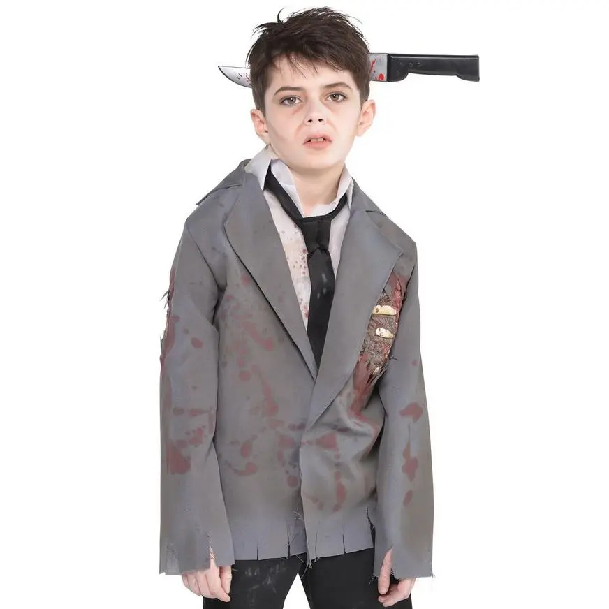 Coat check! The Zombie Jacket for kids features an attached shirtfront with blood-smeared stains and bloody latex ribs poking out of the chest. This Zombie Jacket also comes with an attached necktie for a classy Halloween costume. Shoes, pants, and knife prop not included.