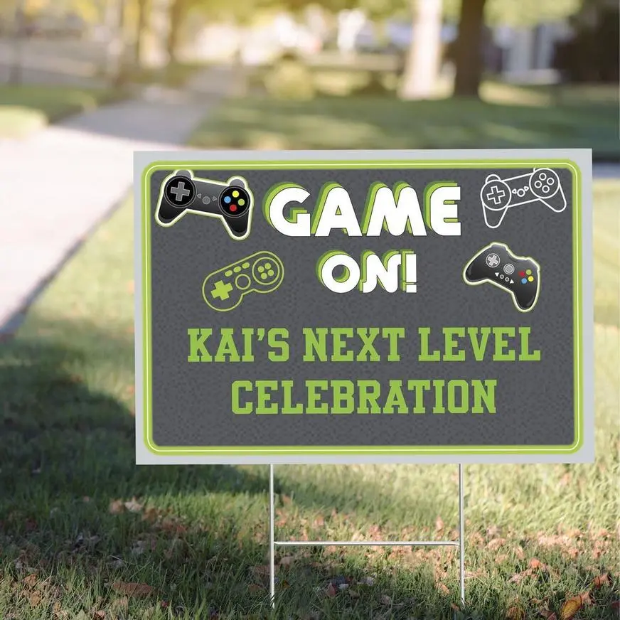 Direct guests to the party with a custom Level Up yard sign. The Bikini Bottom sign features game controllers, a “Game On” headline, a pixelated background, and space for a personalized message. It’s made of sturdy corrugated plastic and can be placed in your lawn using the included metal stake. This durable yard decoration is a festive addition to any celebration.