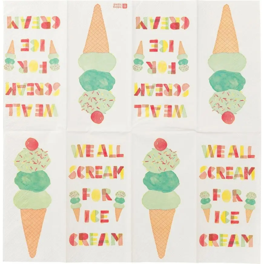 Keep the tables clean at your ice cream party with a Dots & Ice Cream Napkins Duo Pack! This pack includes paper napkins with two different designs. One design features a colorful “We All Scream For Ice Cream” headline against a white background with a picture of an ice cream cone on the other side. The other design features green, orange, pink, red, and yellow dots. Put a stack of these napkins on the table and everybody can enjoy their ice cream without making a mess!