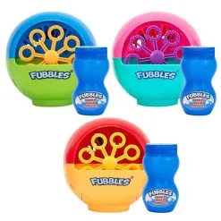 Make any party a pop-pin’ time with a Fubbles Mini Bubble Machine! The round plastic bubble machine includes a bottle of bubble solution. The bubble machine is blue and green, pink and teal, or red and yellow. The color of the bubble machine you receive is a surprise! Use this bubble machine at a summer luau, birthday party, or other event!