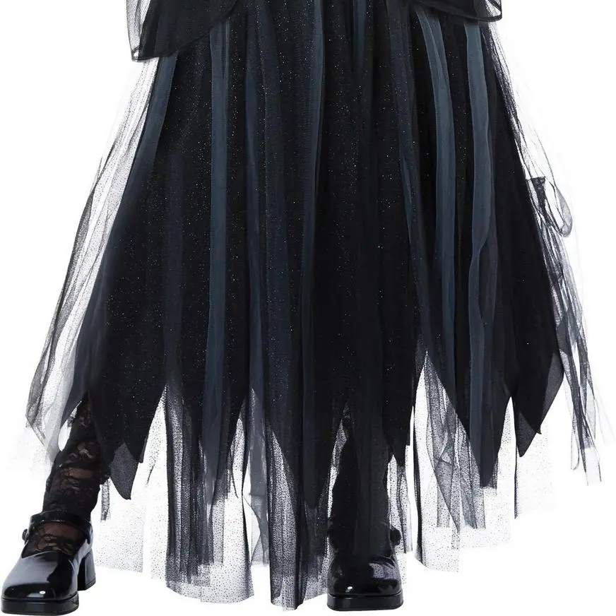 More on Girls Dark Princess Costume: If your daughter thinks colors are too bright and happy, she’ll love the Dark Princess Costume for girls. This evil princess costume features a black dress with a corset-inspired top and mesh sleeves. To add an extra level of creepiness, she can put on the tattered black tulle overskirt and black tiara. This gothic princess costume is the perfect scary outfit for Halloween! Review the size chart for additional sizing information. Shoes, pants, and makeup not included.