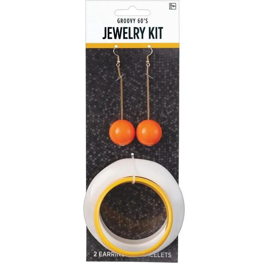 Add some groovy 60s style to your costume with the Mod Jewelry Set! Inspired by 60s Mod fashion, this jewelry set includes earrings featuring orange balls hanging from gold chains, one yellow, round bracelet, and one white, irregularly shaped bracelet. Pair these pieces with colorful Mod miniskirt and your groovy 60s look is complete!