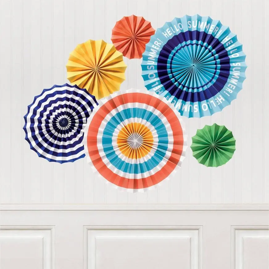 It’s time to say hello to summer fun! These paper fans instantly transform your party space, whether you mount them on the wall or hang them. The six-piece kit includes fans of varying sizes in coral, blue, green, and yellow, with a “Hello Summer” message on one extra-large decoration.