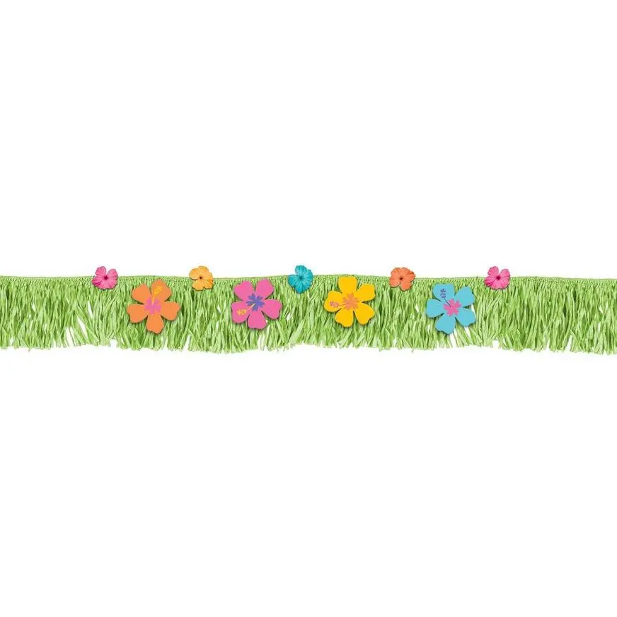 Welcome to paradise! This Hibiscus Fringe Banner transforms your table, banister, or balcony into a lush island landscape within seconds. Hibiscus flower cardstock cutouts and matching fabric floral cutouts decorate the paper green trim on this fun party banner. Lightweight and easy to hang, this Hibiscus Fringe Banner will make a splash at your next island-inspired party.