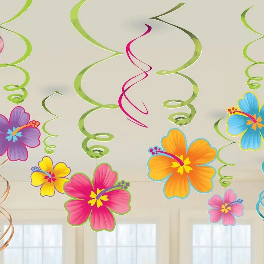 The summer room is now in bloom! Hang these Hibiscus Swirl Decorations from the ceiling, porch, or window frames to create a tropical scene of brilliant hibiscus flowers swaying in the breeze. The two-sided cardstock hibiscus cutouts come attached to lightweight and gleaming plastic swirl decorations, easily mounted indoors or out with Sticky Tack (sold separately) or tape.