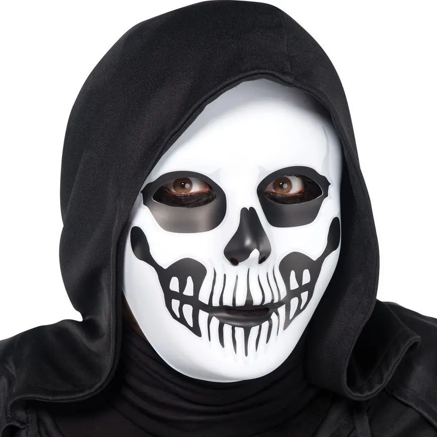 Is Halloween starting to look a little grim? Reap yourself a spooky time in our Horror Skull Mask! Our Horror Skull Mask features a white skeletal face with black hollow eye sockets, nose cavity, and teeth and jaw outline. This versatile mask can be worn as part of any number of scary costumes! The attached elastic band makes this mask easy to wear with large eyeholes for visibility. One size fits most teens and adults.
