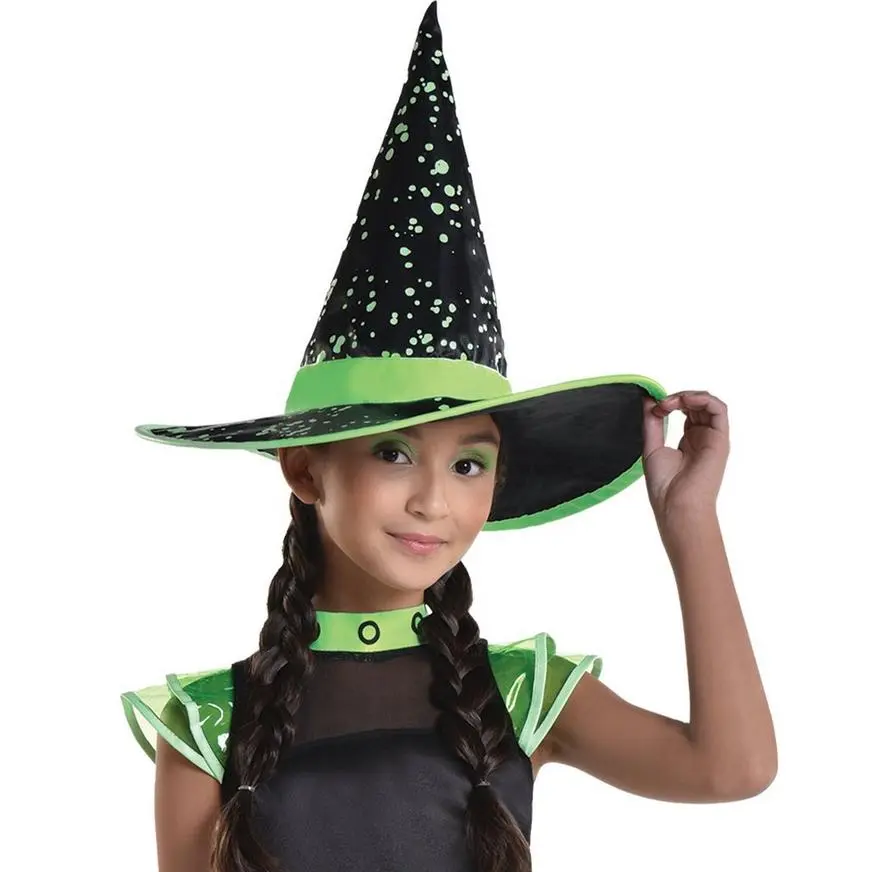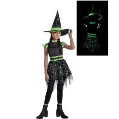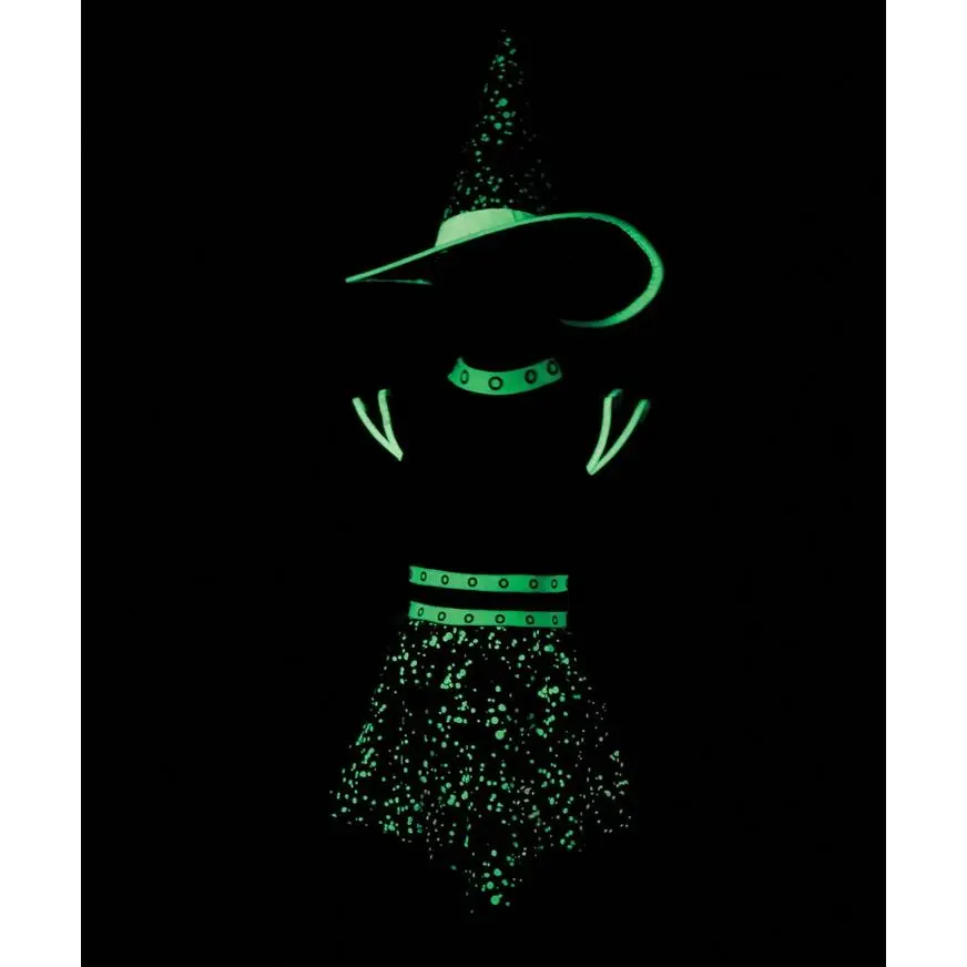 What’s that spooky glow in the Halloween night? It’s the Midnight Witch! This kids’ witch costume features a black dress and black pointed hat, each with green trim that glows in the dark. The dress also features a skirt with tulle tatters.
