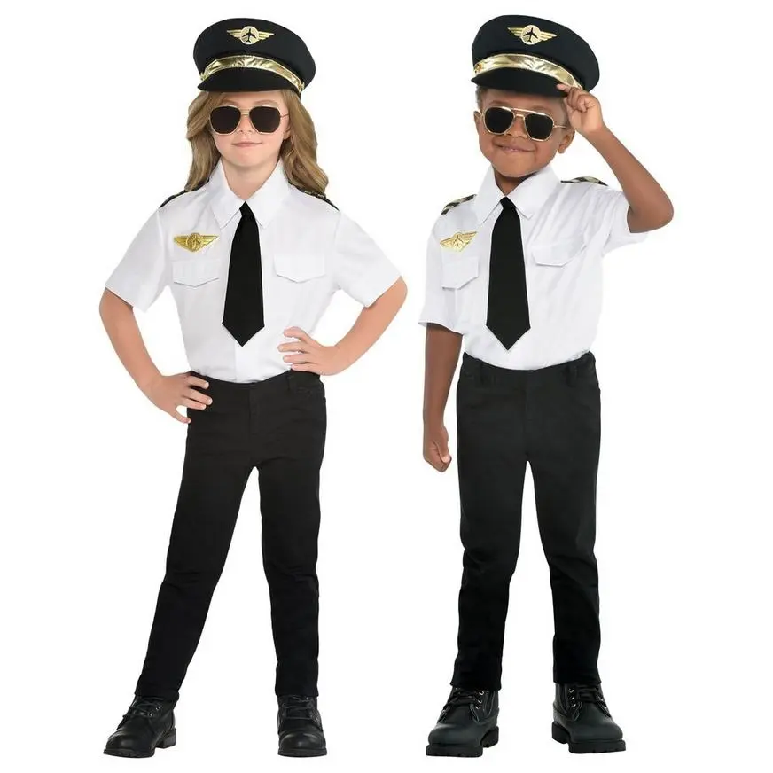 This airplane pilot costume set includes a white value-up shirt with a pair of printed wings on the chest, a simple black tie, a pilot hat with gold details, and aviator glasses to pull it all together. Whether for Halloween or everyday play, this pilot costume will have them ready for takeoff.