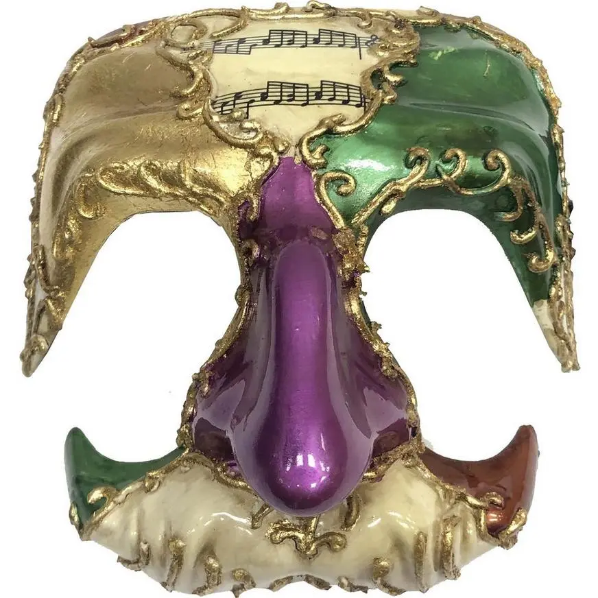 Get a timeless carnival look with a big nose mask! The plastic mask is green, gold, and purple with large eye cutouts and musical notes in the center. The Venetian-style mask has ornate gold trim to finish the look and an elastic band for easy and comfortable wear.