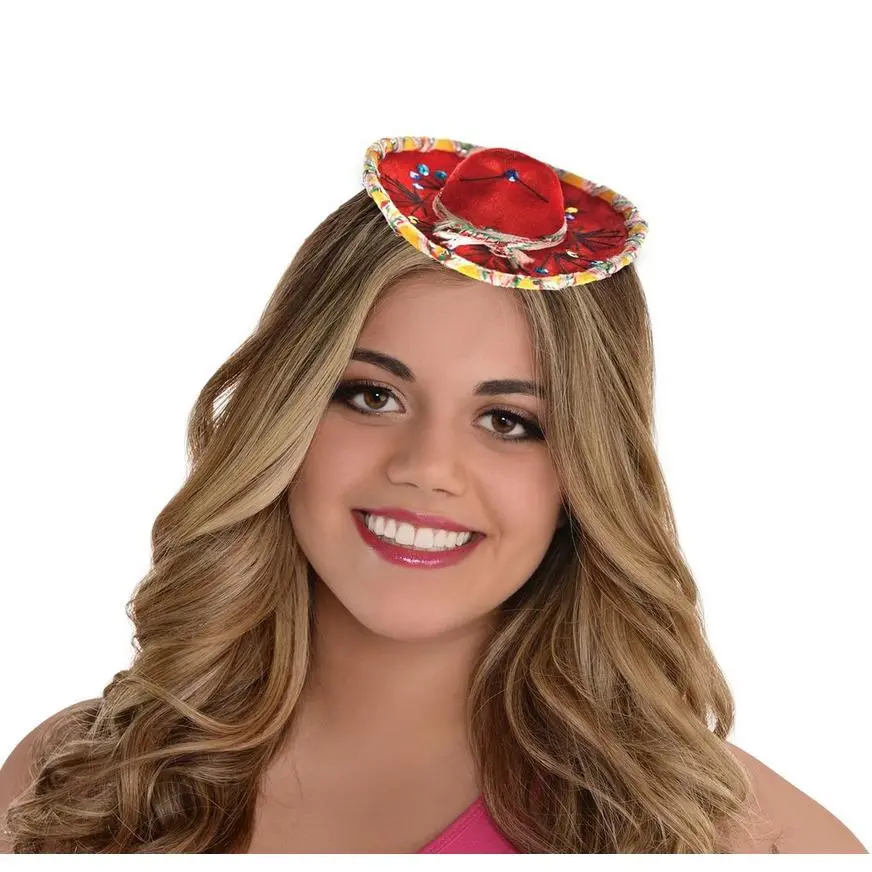 Tip your hat to your amigos and amigas wearing this adorable Mini Red Sombrero! This mini sombrero features a yellow rim with green, red, silver, and white stitching. The surface of the red hat has black stitching with blue, gold, and purple sequins on it. Complete with an elastic band attachment for a snug fit, this mini sombrero is the perfect accessory for your Cinco de Mayo fiesta!