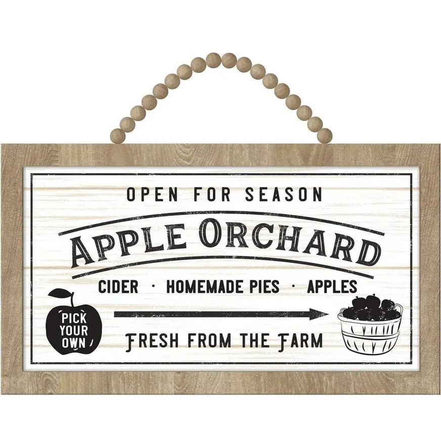 It’s open season! Always wanted to own your own apple orchard and baked goods shop? Now you can have the sign, without all the hard work. This rustic sign says Apple Orchard, Open for Season, highlighting offerings like homemade pies, apples, and cider in black font on a white background in an MDF frame with wood bead loop for hanging.