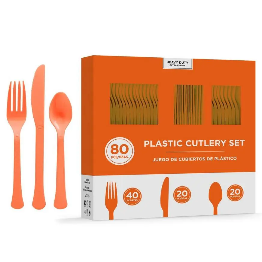 Complete your table settings with high quality cutlery your guests will love. This Orange Heavy-Duty Plastic Cutlery Set contains forks, knives, and spoons for a party of 20. Each utensil is made of heavy-duty plastic that is reusable, recyclable, and dishwasher safe, and they come in a cardboard box for convenient storage.