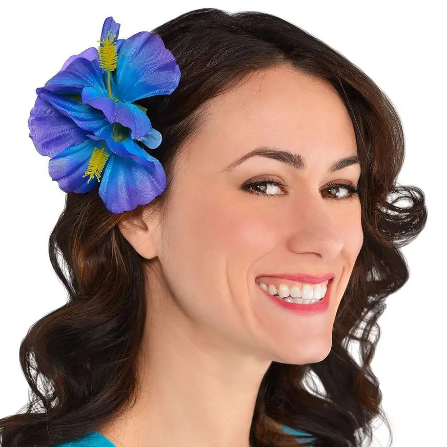 Put on some luau loveliness! This Purple Hibiscus Barrette features a delicate purple and blue fabric hibiscus flower with green stamen. An attached hair barrette keeps the flower secure in your hairdo for perfect Hawaiian style.