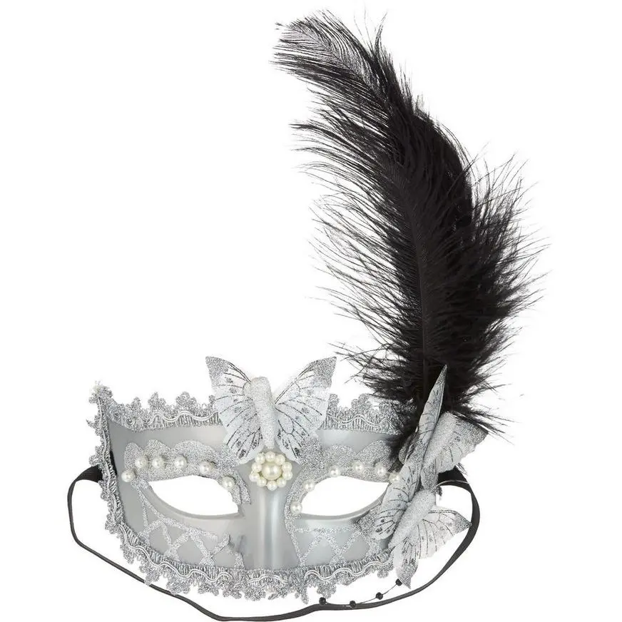 Dazzle at the party in the Silver Butterfly mask! This masquerade mask is adorned with 3 silver glitter butterflies, faux pearls, and a black feather.