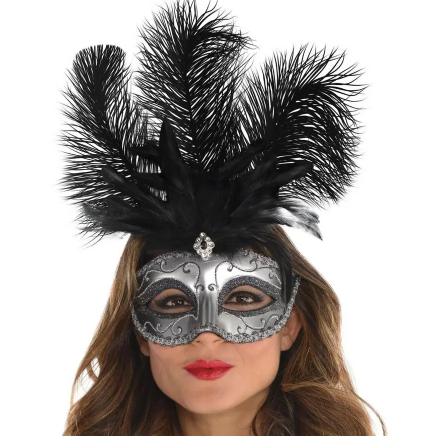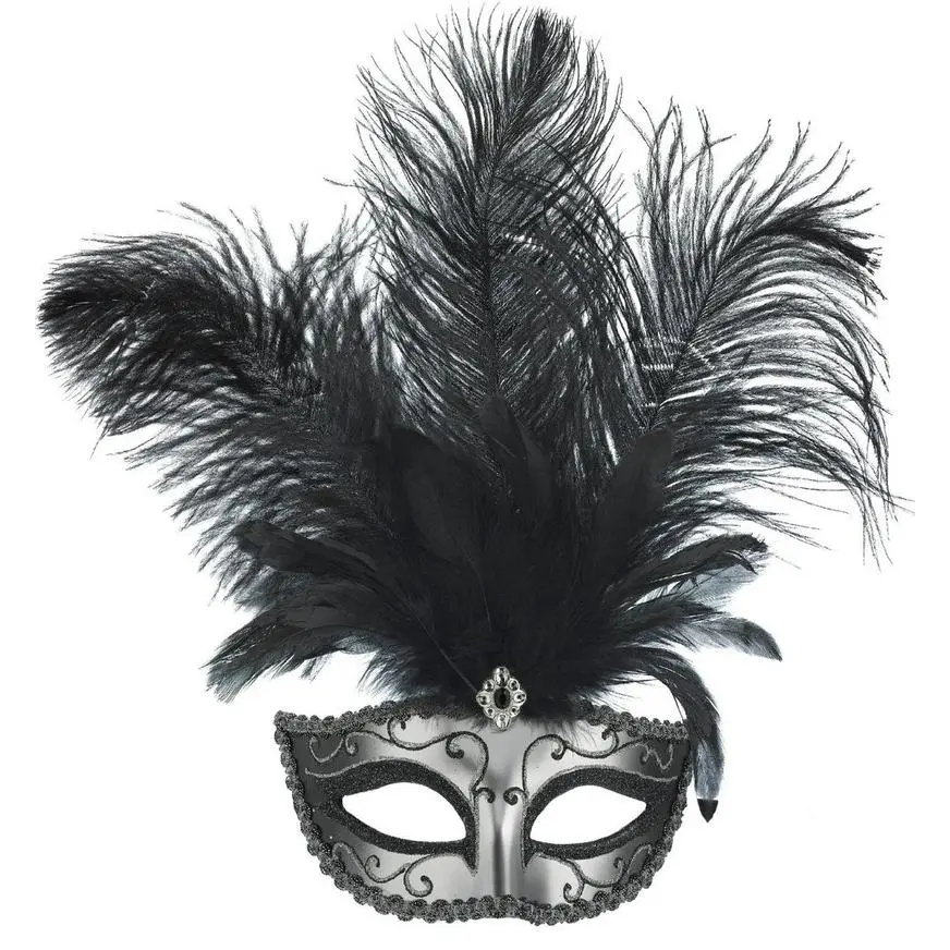 Disguise yourself in extravagance with a Silver Feather Dominance Masquerade Mask! This silver eye mask features baroque detailing around the edges and giant black genuine feathers attached to the top. The elastic band keeps it secure while you dance with a mysterious stranger at the ball. It makes an opulent addition to your masquerade costume!