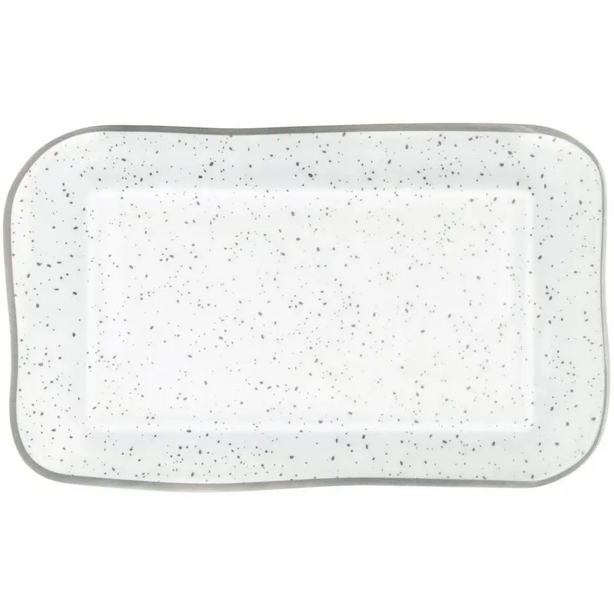 Entertain in style with this premium melamine platter. It comes in classic white and features a metallic silver border and delicate silver speckling throughout. With the look of rustic ceramic and the convenience of plastic, this rectangular platter is a home staple. Its simple color palette is suitable for a variety of occasions—from everyday to special celebrations.