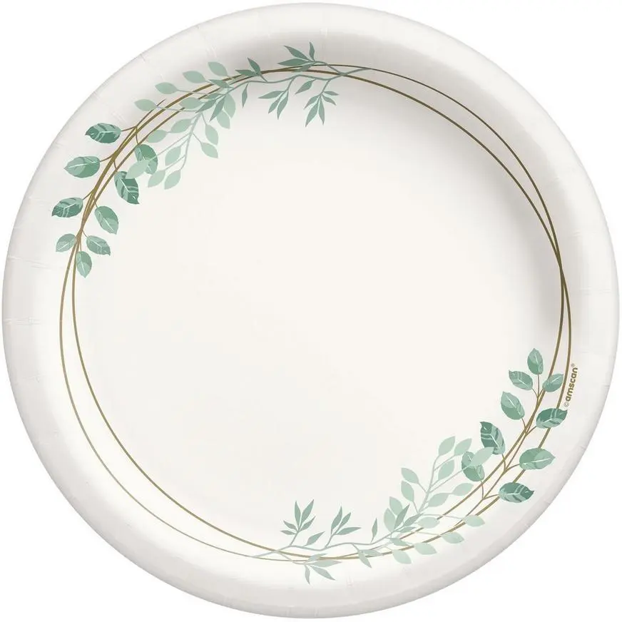 Suitable for so many occasions, these disposable paper plates are white with a beautiful circle of green foliage and golden brown vines. They add a touch of sophistication, but also make for a quick and easy clean up after the party is over!