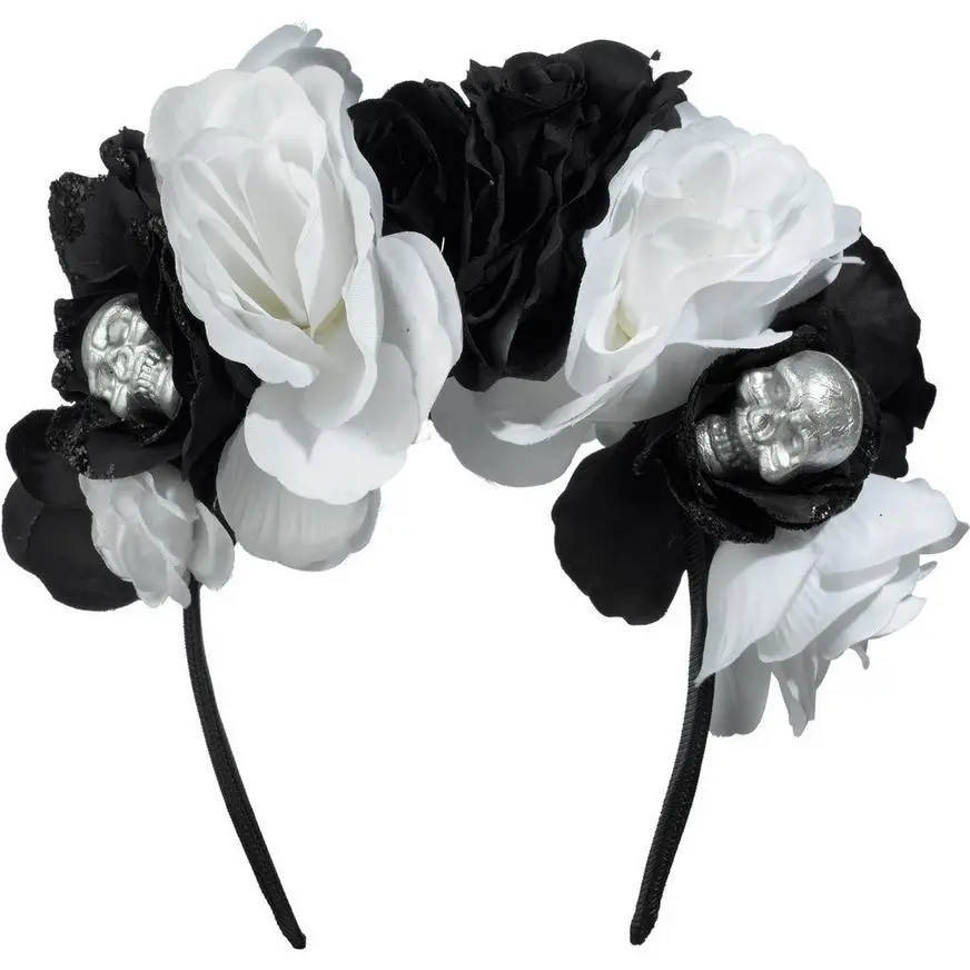 For a killer addition to your skeleton costume, our Black & Bone Floral Skull Headband Deluxe is to die for! This black satin headband is covered with black and white fabric roses and has a silver resin skull on either side. Complement your outfit for a Halloween party or Day of the Dead celebration!