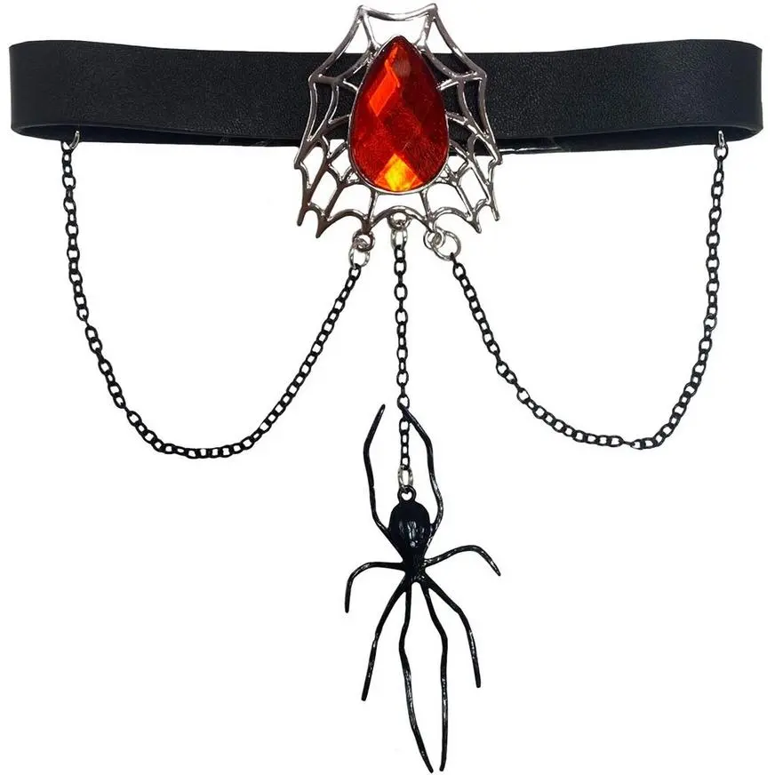 Add cool and creepy vibes to your Halloween look with this black leather choker. It has a ruby and spiderweb charm in the center of your throat, and a metal chain from which dangles a plastic black widow spider. Spooky!