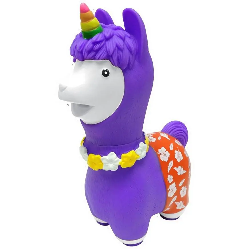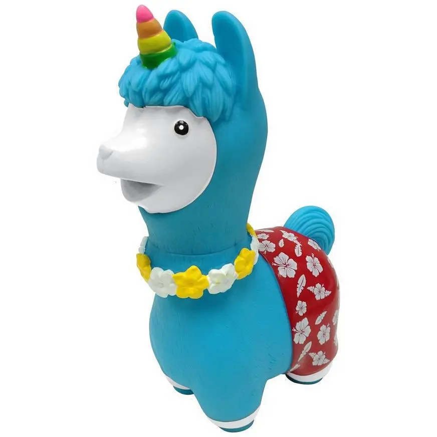 Your little one can bring a Squeeze Me Tropical Llama-Corn with them on your next vacation! The squeeze toy comes in blue, orange, pink, or purple and the color you receive is a surprise. It’s rainbow unicorn horn, lei, and tropical swim shorts make it the perfect beach-day companion. Give it a squeeze to hear its funny sound!