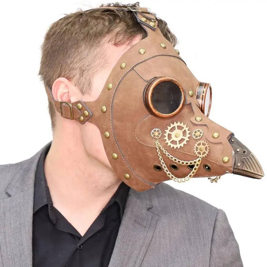 Is the plague doctor a healer or bringer of death? You decide in the Steampunk Plague Doctor Mask! Made of brown faux-leather, this mask features gold metal gear and chain decorations, bronze-rimmed goggles, and a dull bronze beak tip. The mask comfortably secures with three buckle straps.
