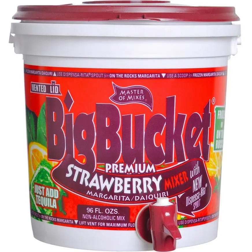 Mix up tasty party drinks to satisfy a crowd! This Strawberry & Margarita Daiquiri Mix Bucket Dispenser is conveniently packaged in a giant bucket with a push spout and a built-in vent plug on the lid. Just add your favorite tequila to this non-alcoholic drink mix, stir it up or freeze it, and enjoy!