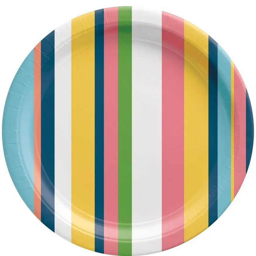 Summer’s here, and it’s time to party! Create a colorful table with these large round paper dinner plates. They feature classic stripes in cheerful shades: blues, coral, green, pink, and yellow. Mix and match with other tropical accessories for your celebration.