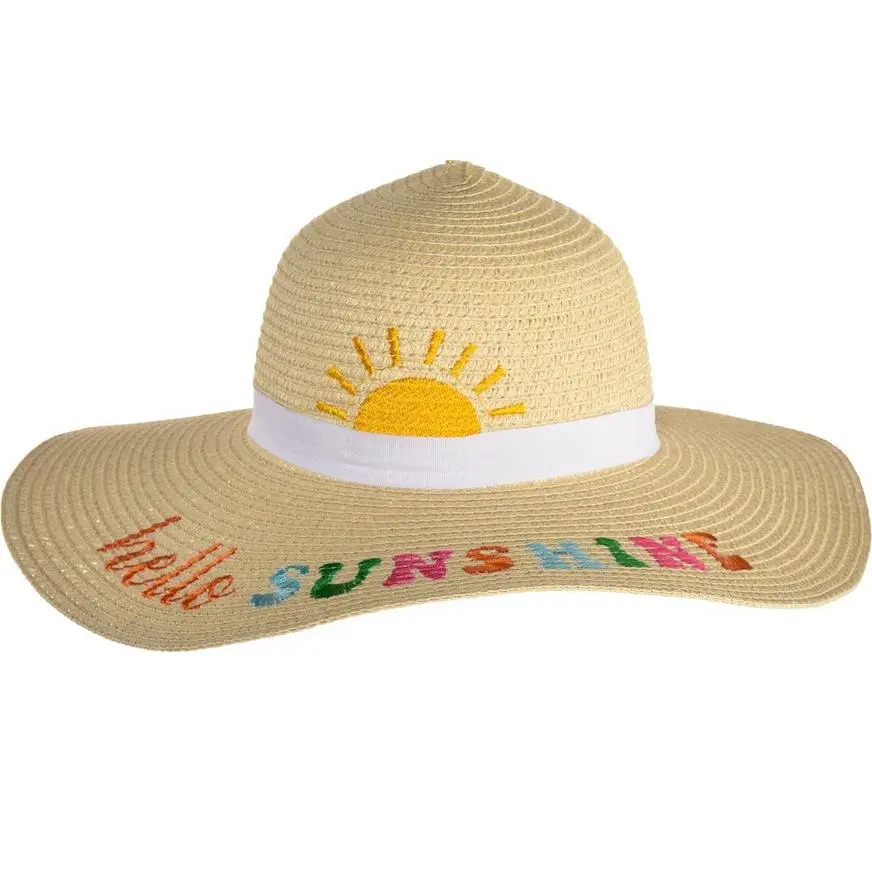 Keep them shaded and stylish in the summer sun with a big floppy straw hat. This straw hat for kids features a floppy wide brim, an attached white hatband, the headline “Hello Sunshine” on the brim, and a sun icon on the crown.