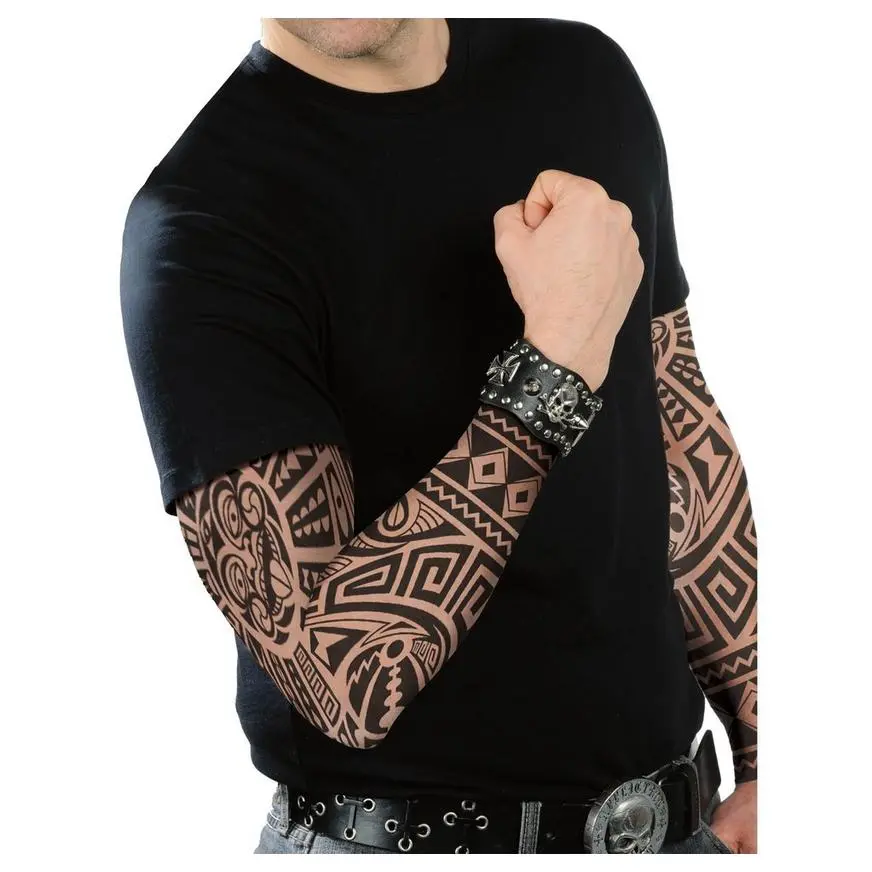 A tribal totem for your forearm! These Tribal Tattoo Sleeves feature black printed tribal designs including a skull and vertebrae. Package includes 2 Tribal Tattoo Sleeves.