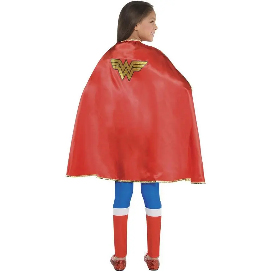Every superhero needs a cape like this red Wonder Woman Cape! The glossy red cape features a glittery Wonder Woman logo centered on the back and metallic gold trim and easily fastens with a hook-and-loop closure at the neck. Put on a Wonder Woman Cape as part of your Wonder Woman costume or anytime you feel like dressing up as a superhero! Shoes and pants not included.